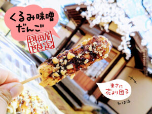 江口だんごというと、こし餡・抹茶・胡麻餡・みたらし・海苔が入った 「五色だんご」を連想しがちですが、こちら摂田屋店でしか購入できない「くるみ味噌だんご」もおすすめ。