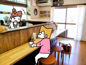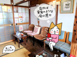私のお気に入りはイートインの店内。まるで実家のような畳と木の梁は 安心感たっぷり。