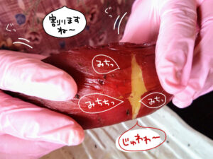割ろうと圧をかけただけで甘~い蜜がさつまいもの皮を突き破るかのごとく染み出る勢い!